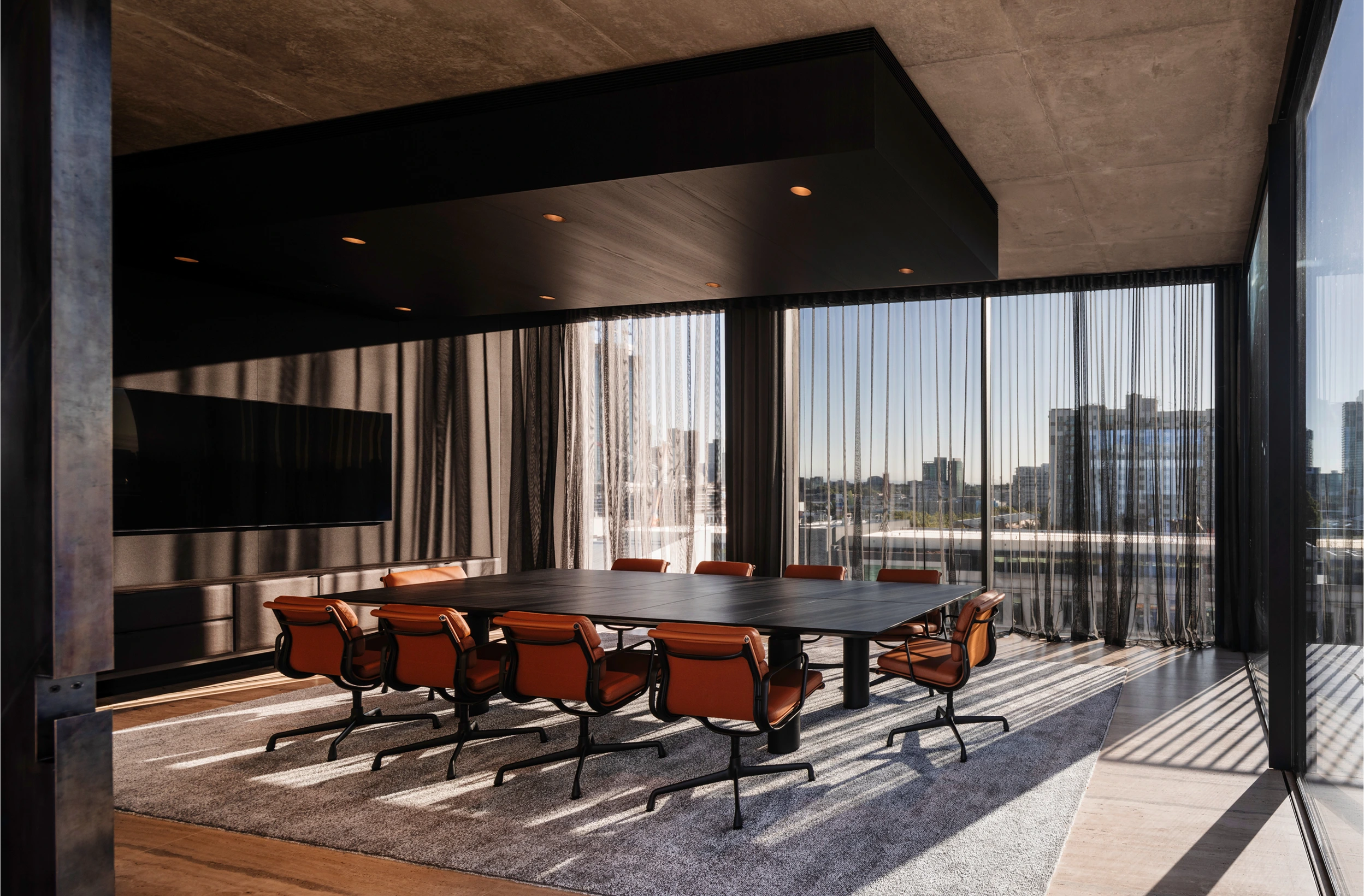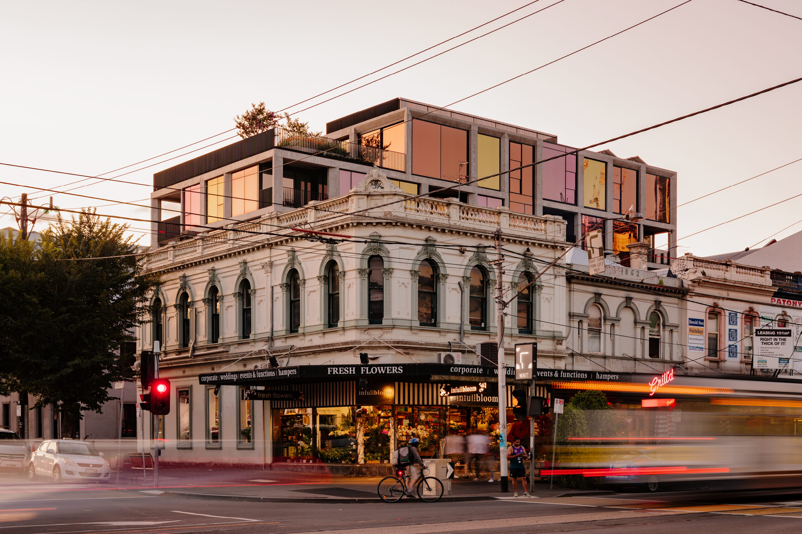 The original Victorian terrace on Dorcas Street has been carefully restored, reimagined as private offices that retain the elegance of its heritage while meeting the needs of today. Along Charles Street, the design takes a bold artistic turn. Drawing inspiration from Giblett’s evocative paintings of urban life, the façade features panels of Corten steel in varying shades, creating a tactile and dynamic streetscape that celebrates South Melbourne’s creative spirit.